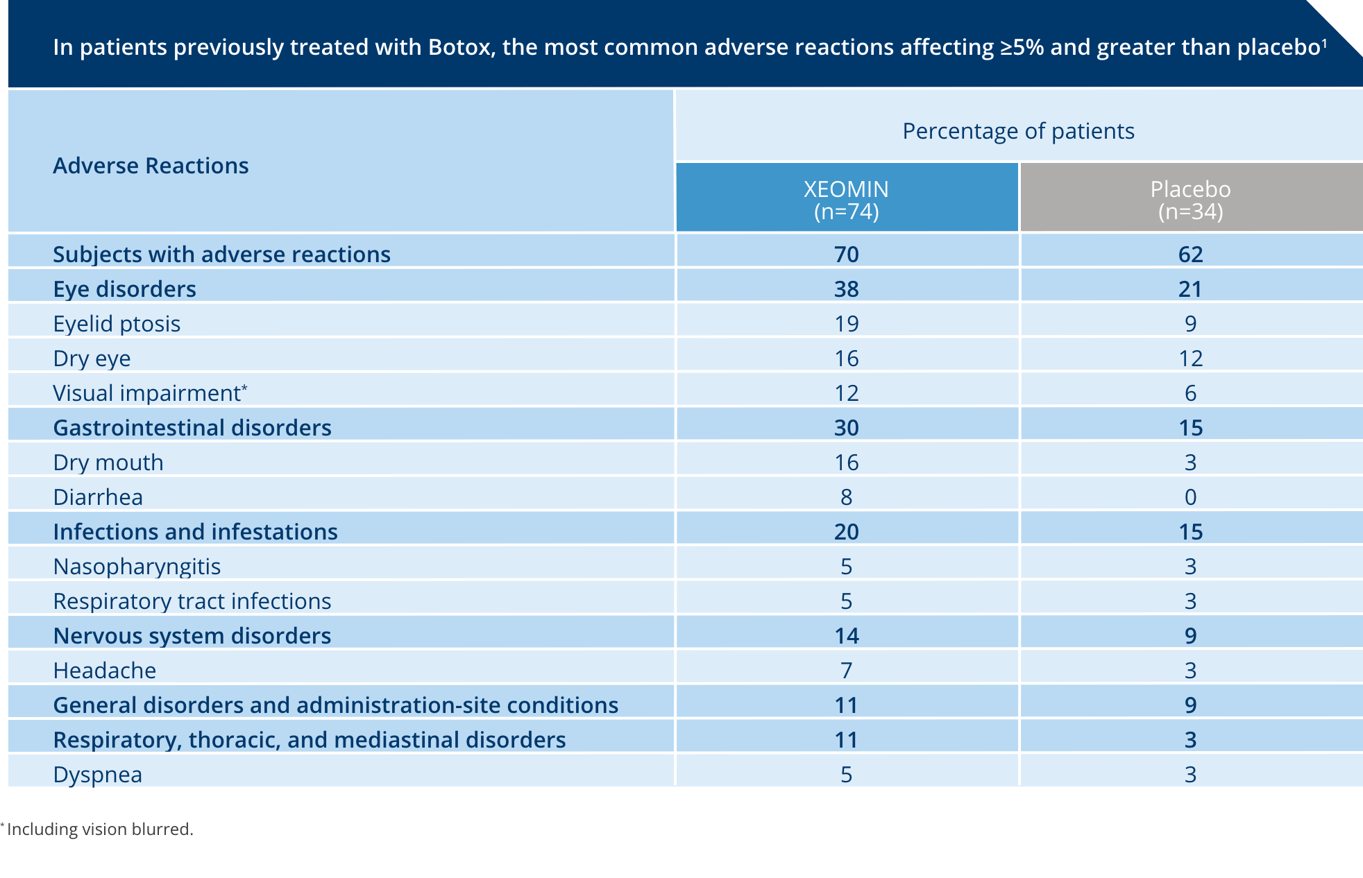 • Blepharospasm in adults (≥10% of patients): eyelid ptosis, dry eye, visual impairment, and dry mouth.