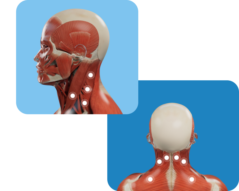 Markings show examples of muscles that may be treated for cervical dystonia in adults; however, not all possible injection locations are shown. Not all patients will receive treatment in the same muscle(s). Your doctor will determine the appropriate locations and doses for XEOMIN injection.